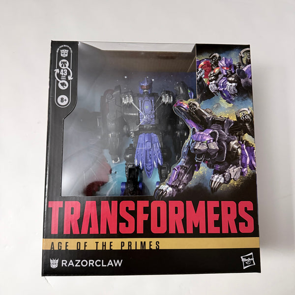 Experience the epic universe of Transformers robots with the Transformers Razorclaw toy! The 7 1/2-inch (19 cm) Leader Class figure converts from robot action figure to eagle-winged tiger mode in 43 steps. With intricate poseability and attachable accessories like blasters and wing blades, this Razorclaw action figure makes an awesome addition to any collection. Ages 8 and up.