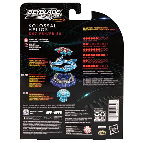 Compete with the elite using the authentic Japanese-inspired Beyblade Burst Pro Series battle system! Beyblade Burst Pro Series tops, launchers, and Pro Series Beystadium offer authentic components and battle performance features.Beyblade Burst Pro Series Starter Pack includes 1 Pro Series left-spin launcher, sticker sheet, and 1 left-spin competitive battling top: Balance type Kolossal Helios D07-PSK PR-30 (right-spin launcher sold separately, subject to availability). Top includes die-cast metal parts for a heavy weight. Kolossal Helios balance type top configures to attack mode with 5 blades or defense mode with 10 blades depending upon how you align the Superking chip energy layer with the left- and right-spin compatible double chassis, as well as a free-spinning guard on the performance tip. Official Beyblade Burst Pro Series Starter Packs by Hasbro make exciting kids gifts for Beyblade Burst fans and collectors. Ages 8 and up.
