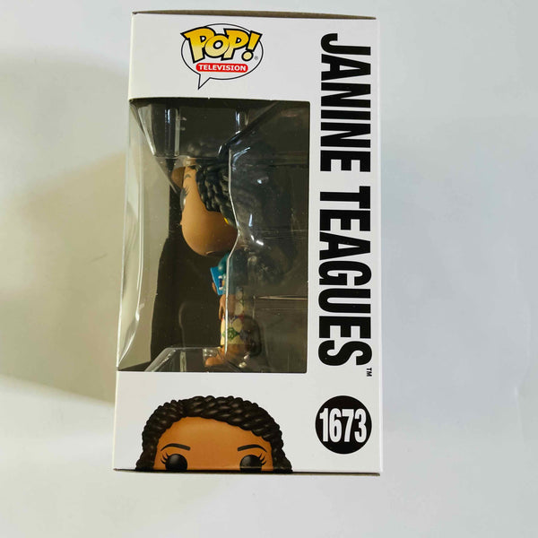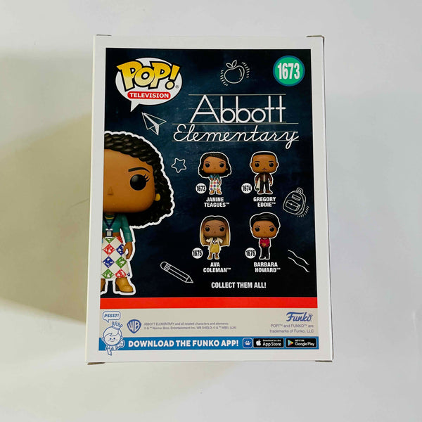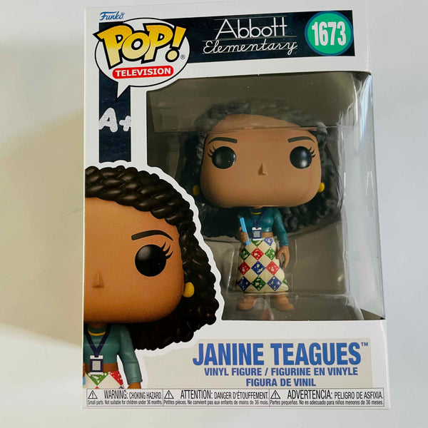 This Abbott Elementary Janine Teagues Funko Pop! Vinyl Figure #1673 measures approximately 3 3/4-inches tall and comes packaged in a window display box. For ages 3 and up.