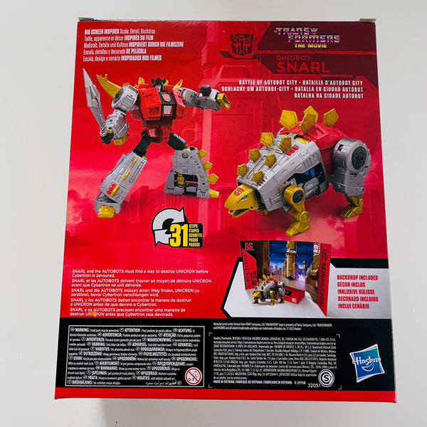 Bring the epic action of the Transformers movies from the big screen into your collection with the Transformers Studio Series Leader Class Dinobot Snarl 8 1/2-inch tall action figure! Snarl and the Autobots must find a way to destroy Unicron before Cybertron is devoured. Transformers Studio Series toys are collectible action figures for ages 8 and up that feature movie-inspired details and accessories. Convert the action figure from robot to stegosaurus mode in 31 steps and pose the Dinobot Snarl toy in the included Battle of Autobot City removable backdrop scene. Includes sword accessory and backdrop.