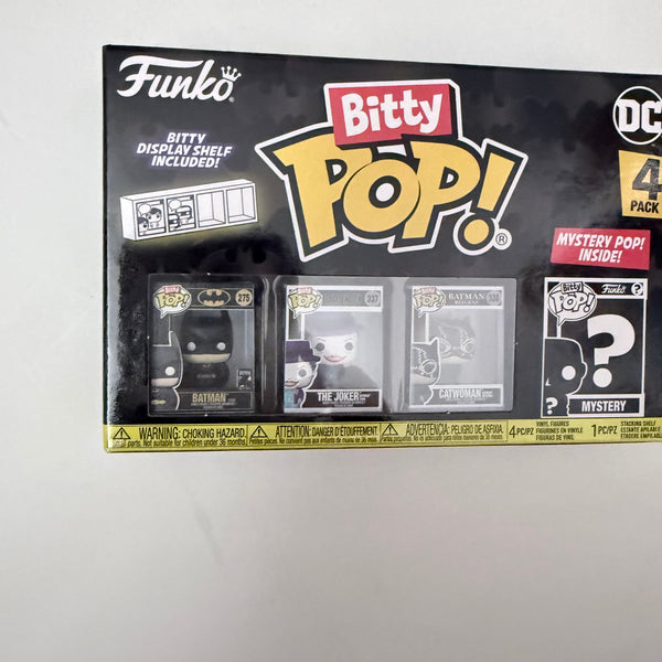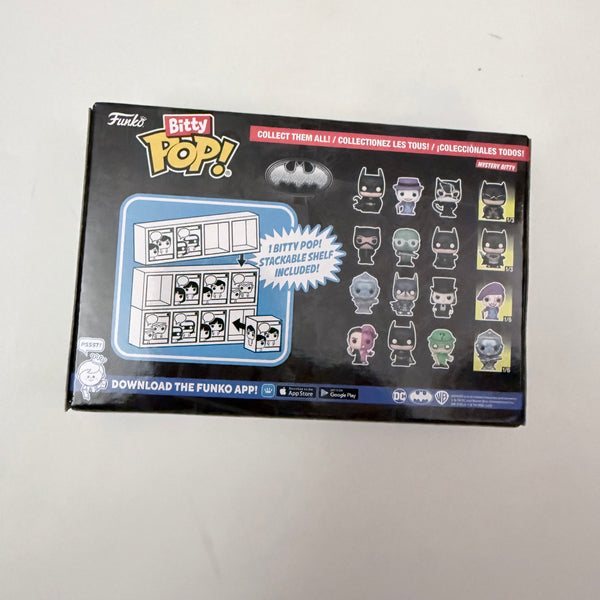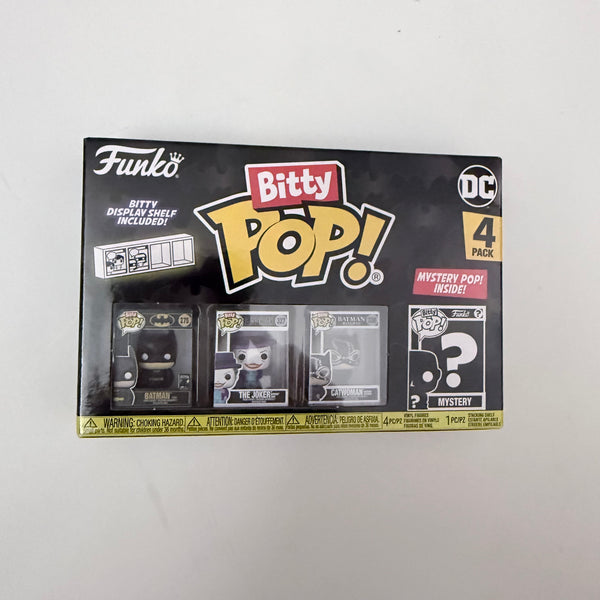 Your favorite Pops! have been shrunk into Bitty Pops! Expand your DC collection with this assortment of Bitty Pop! figures featuring your most beloved heroes and villains! This 4-pack includes Bitty Pop! Batman™ - 1989, Bitty Pop! The Joker™ - Batman™ 1989, Bitty Pop! Catwoman™ - Batman™ Returns, and a mystery Bitty Pop! figure. The possible mystery Bitty Pops! are Hyper Rare (1/6) Batman™ - Justice League™, Hyper Rare (1/6) Batman™ - Batman v Superman™, Rare (1/3) The Joker™ - Batman™ 1989 (Makeup), and Rare (1/3) Mr. Freeze™ - Batman™ & Robin (Metallic). Bitty Pops! are packaged in hard acrylic cases with detachable bottom lids. Detachable bottom lids double as acrylic bases, to which the Bitty Pop! figures are adhered. Sort and arrange your Bitty Pops! with the included display case! Acrylic display cases are stackable and hold four Bitty Pop! figures each. Vinyl figures are approximately 0.9-inches tall. Four figures per single package purchase. Warning: Choking Hazard. Collectibles are small. Not for children under the age of 3 years old. Item selection is random, as each piece is in blind packaging. We cannot accept requests for specific items. You may receive duplicate figures.