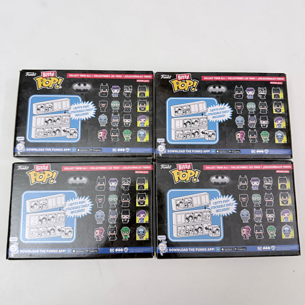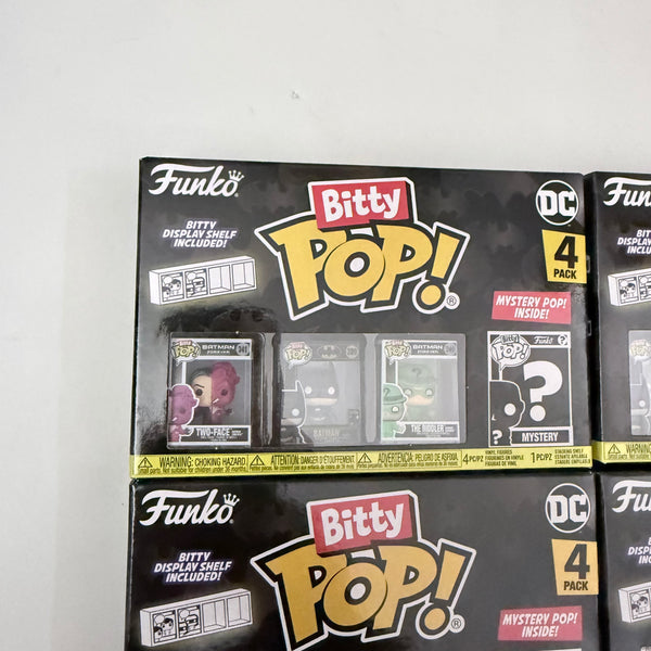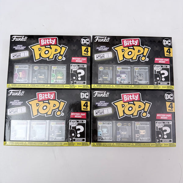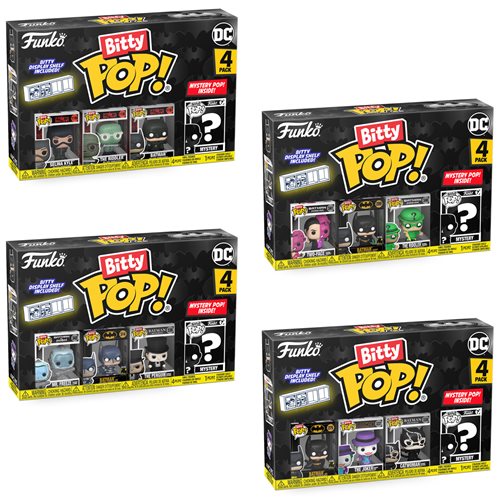 Your favorite Batman 85th Anniversary Pops! have been shrunk into Bitty Pops! Expand your collection with this assortment of Bitty Pop! figures you get all 4 sets of 4 pack. Each pack has 3 known character and one mystery. May receive duplicate.