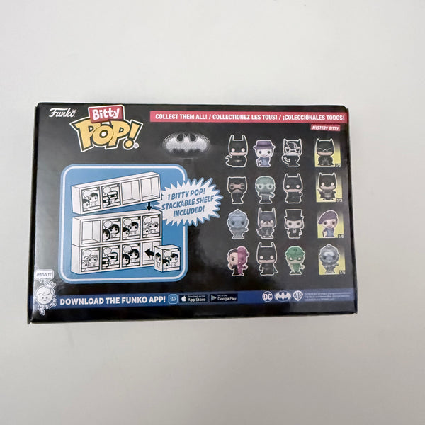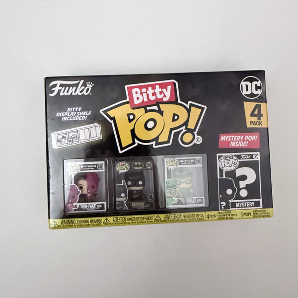 Your favorite Pops! have been shrunk into Bitty Pops! Expand your DC collection with this assortment of Bitty Pop! figures featuring your most beloved heroes and villains! This 4-pack includes Bitty Pop! Two-Face™ - Batman Forever™, Bitty Pop! Batman™ - Forever, Bitty Pop! The Riddler™ - Batman Forever™, and a mystery Bitty Pop! figure. The possible mystery Bitty Pops! are Hyper Rare (1/6) Batman™ - Justice League™, Hyper Rare (1/6) Batman™ - Batman v Superman™, Rare (1/3) The Joker™ - Batman™ 1989 (Makeup), and Rare (1/3) Mr. Freeze™ - Batman™ & Robin (Metallic). Bitty Pops! are packaged in hard acrylic cases with detachable bottom lids. Detachable bottom lids double as acrylic bases, to which the Bitty Pop! figures are adhered. Sort and arrange your Bitty Pops! with the included display case! Acrylic display cases are stackable and hold four Bitty Pop! figures each. Vinyl figures are approximately 0.9-inches tall. Four figures per single package purchase. Warning: Choking Hazard. Collectibles are small. Not for children under the age of 3 years old. Item selection is random, as each piece is in blind packaging. We cannot accept requests for specific items. You may receive duplicate figures.