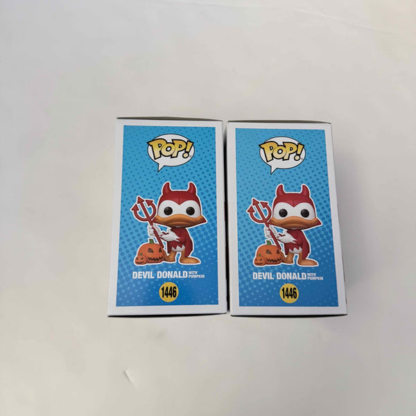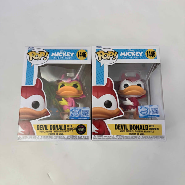 “Boy, oh boy!” Enjoy a night of trick-or-treating and jack-o-lantern carving alongside this Devil Donald with Pumpkin Pop! figure! Featuring his classic Halloween costume, complete with a pitchfork and cape, Donald Duck is ready to celebrate with his friends in your Disney Funko Pop! collection. This Mickey and Friends Devil Donald with Pumpkin Funko Pop! Vinyl Figure #1446 - Specialty Series measures approximately 3 1/2-inches tall and comes packaged in a window display box. This set includes 2 funko, the common and the chase. will ship with protector and double box.