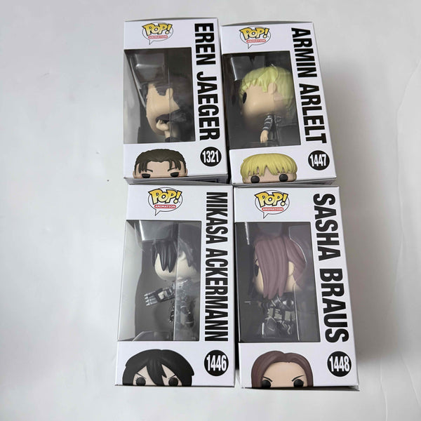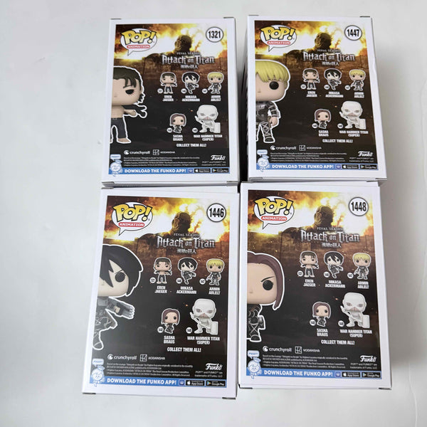 Funko Pop! Animation Attack on Titan S5 Set of 4 includes 4 pops in mint / near mint condition. Each figure measures approximately 3 3/4-inches tall and comes packaged in a window display box. Will ship double boxed.