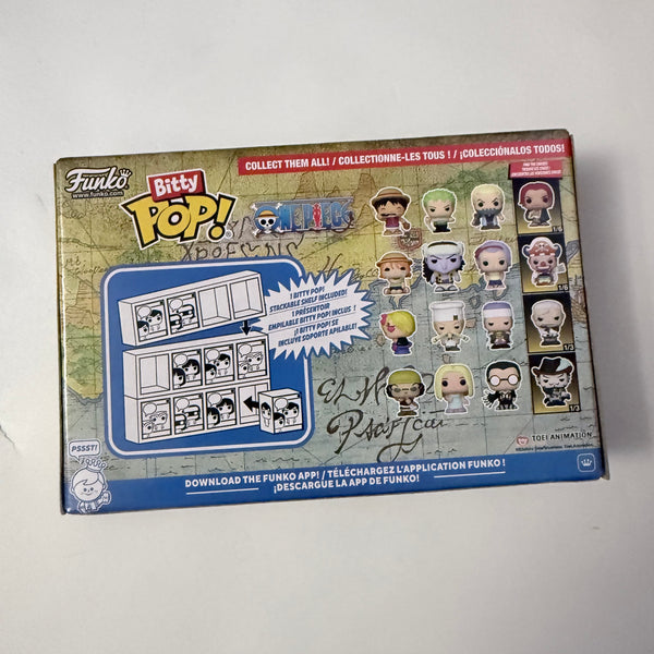 This One Piece Luffy Funko Bitty Pop! Mini-Figure 4-Pack includes:Monkey D Luffy, Roronoa Zoro, Axe-Hand Morgan and Smoker (1/3)