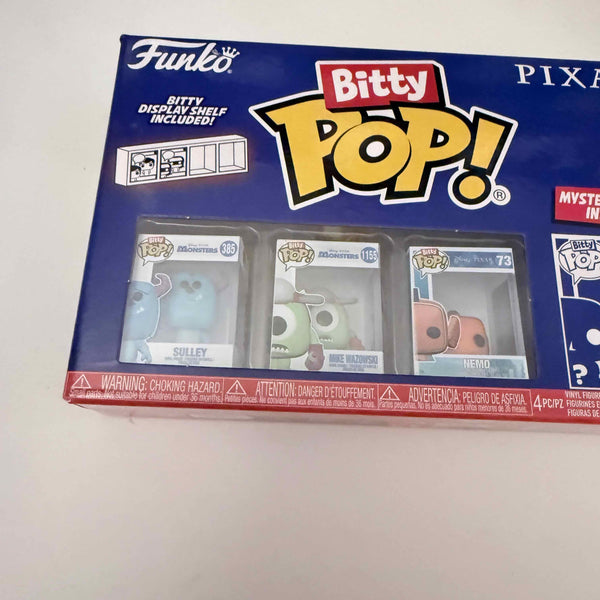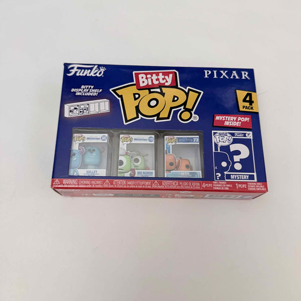 Your favorite Pops! have been shrunk into Bitty POP! collectibles! Expand your Disney Pixar collection with this assortment of Bitty POP! figures featuring your most beloved animated characters! This 4-pack includes Bitty POP! Sulley, Bitty POP! Mike Wazowski, Bitty POP! Nemo, and a mystery Bitty POP! figure. The possible mystery Bitty POP! collectibles are Hyper Rare (1/6) Meilin Lee, Hyper Rare (1/6) Alfredo Linguini, Rare (1/3) Dory, and Rare (1/3) Joy.