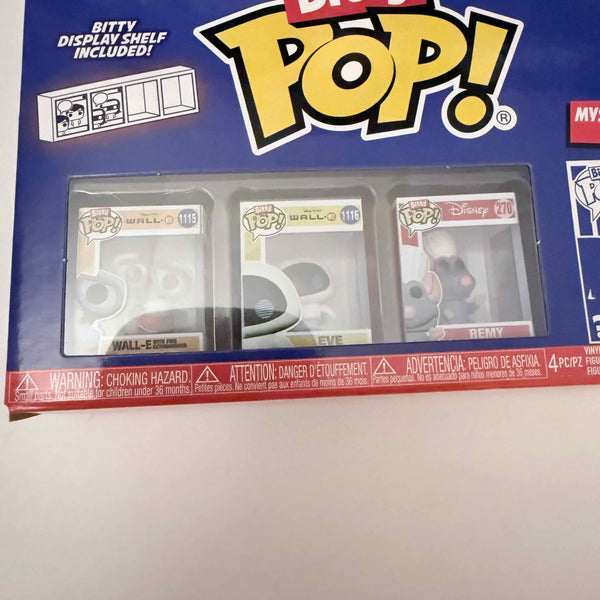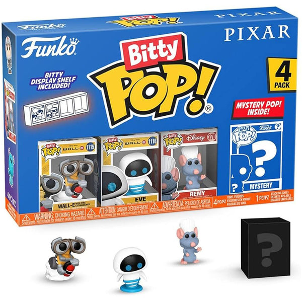 Your favorite Pops! have been shrunk into Bitty POP! collectibles! Expand your Disney Pixar collection with this assortment of Bitty POP! figures featuring your most beloved animated characters! This 4-pack includes Bitty POP! WALL-E with Fire Extinguisher, Bitty POP! EVE, Bitty POP! Remy, and a mystery Bitty POP! figure. The possible mystery Bitty POP! collectibles are Hyper Rare (1/6) Meilin Lee, Hyper Rare (1/6) Alfredo Linguini, Rare (1/3) Dory, and Rare (1/3) Joy. Bitty POP! collectibles are packaged in hard acrylic cases with detachable bottom lids. Detachable bottom lids double as acrylic bases, to which the Bitty POP! figures are adhered. Sort and arrange your Bitty POP! collectibles with the included display case! Acrylic display cases are stackable and hold four Bitty POP! figures each. Vinyl figures are approximately 0.9 in (2.3 cm) tall. Four figures per single package purchase.